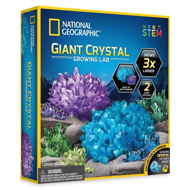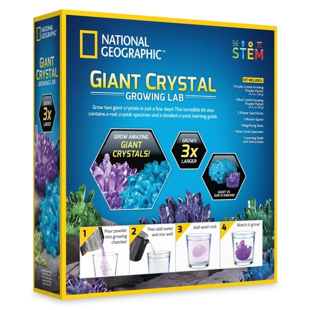 Grow two massive crystals with the National Geographic Giant Crystal Growing Lab! These crystals are three-times larger than our standard crystals and grow fully in just a few days. Your kids will be astounded as they watch these crystals take shape and will learn the science behind crystal formation in our detailed, full-color learning guide. This kit also includes a magnifying glass and real crystal specimen.