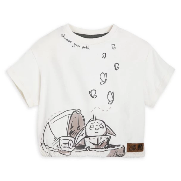 ”Choose your path.” Sage advice and the sweetest artwork make this Grogu fashion tee the cutest in the galaxy. Inspired by Star Wars: The Mandalorian, it features Grogu smiling under a flurry of butterflies. Adorable Grogu and stylish details like pretty embroidery will make them choose this semi-crop tee again and again.