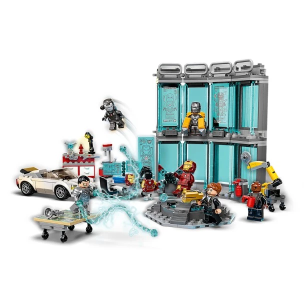 - Familiar items from the movies include a sports car with Stark Expo model-map, a robot assistant arm, a work area with tools, and lots of authentic accessories