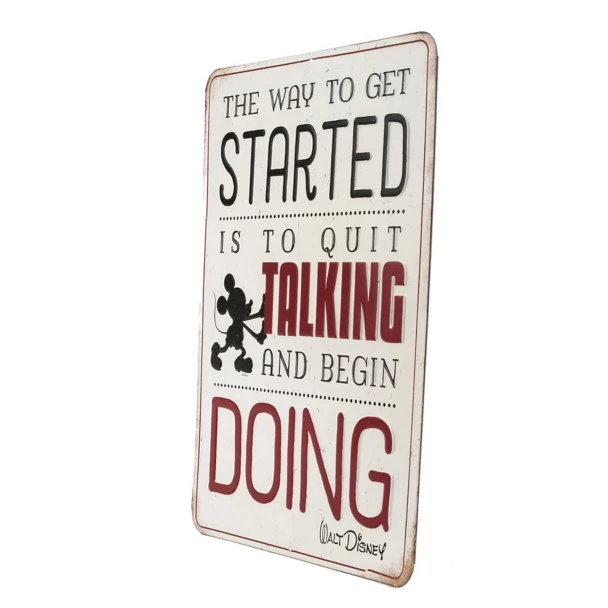 Mickey is silhouetted alongside an inspirational quote from his creator on this tin wall dΓ©cor. ” . . . Quit Talking and Begin Doing,” said Walt Disney, and he did a lot of ”Doing.” Follow his advice and do get this piece for your home.