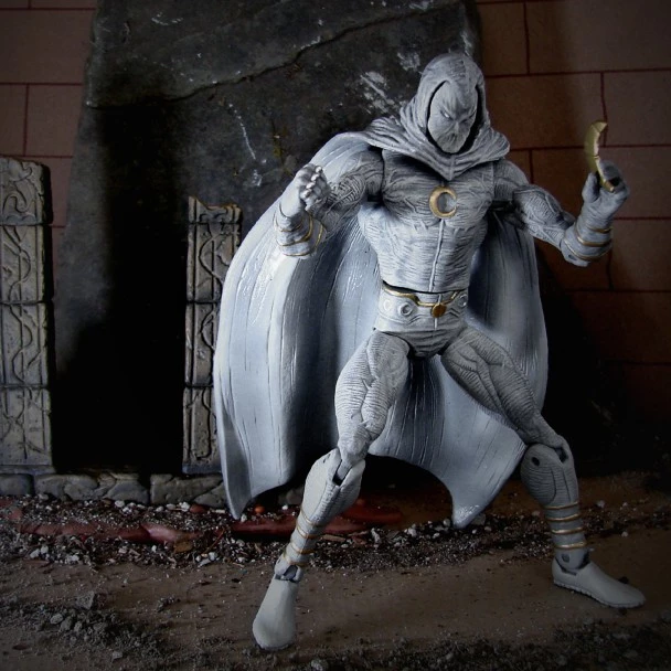 With the Moon Knight series debuting on Disney+, Marvel Select revisits a long-lost character in the line. A Moon Knight figure has not been offered in over a decade, but now makes his triumphant return thanks to shopDisney.com. This exclusive release comes with a diorama base featuring the doorway to the temple of the Egyptian moon god Khonshu, plus two moon-shaped throwing knives.