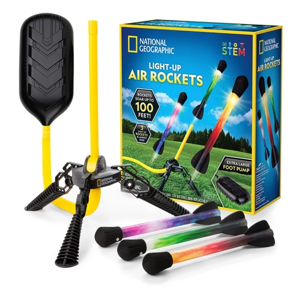 - Includes three LED light-up rockets, launch base, foot pump, learning guide, and instructions