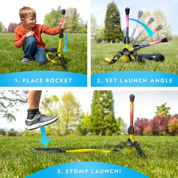 - Press foot pump to launch rockets more than 100 feet in the air!Β