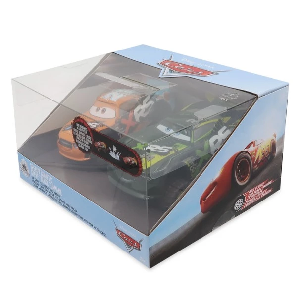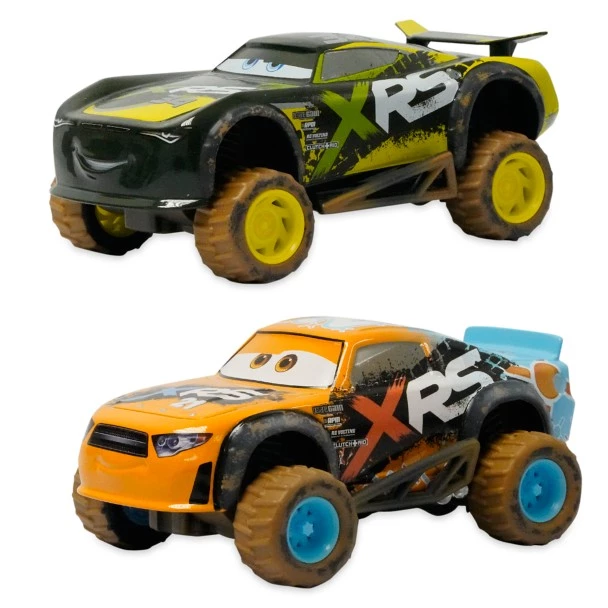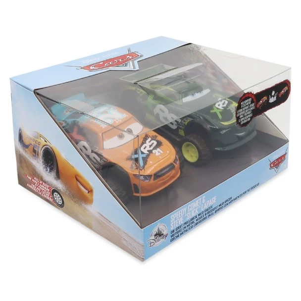 Zoom to the finish line at super speed with this die cast set featuring Speedy Comet and Steve ”Slick” LaPage from Cars 3. Both pullback vehicles are splattered with ”mud” which magically disappears in cold water.
